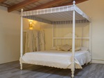 Modernist bed is part of the arrival of modernist movement in Mallorca, early in the twentieth century. With the colour modernist bed, Mallorca Furniture has updated this historical. Just painting in white and keeping the floral motives on the top of the headbed, besides the new stretched four pillar and the canvas cover are thought to create a chill and pleasant atmosphere.